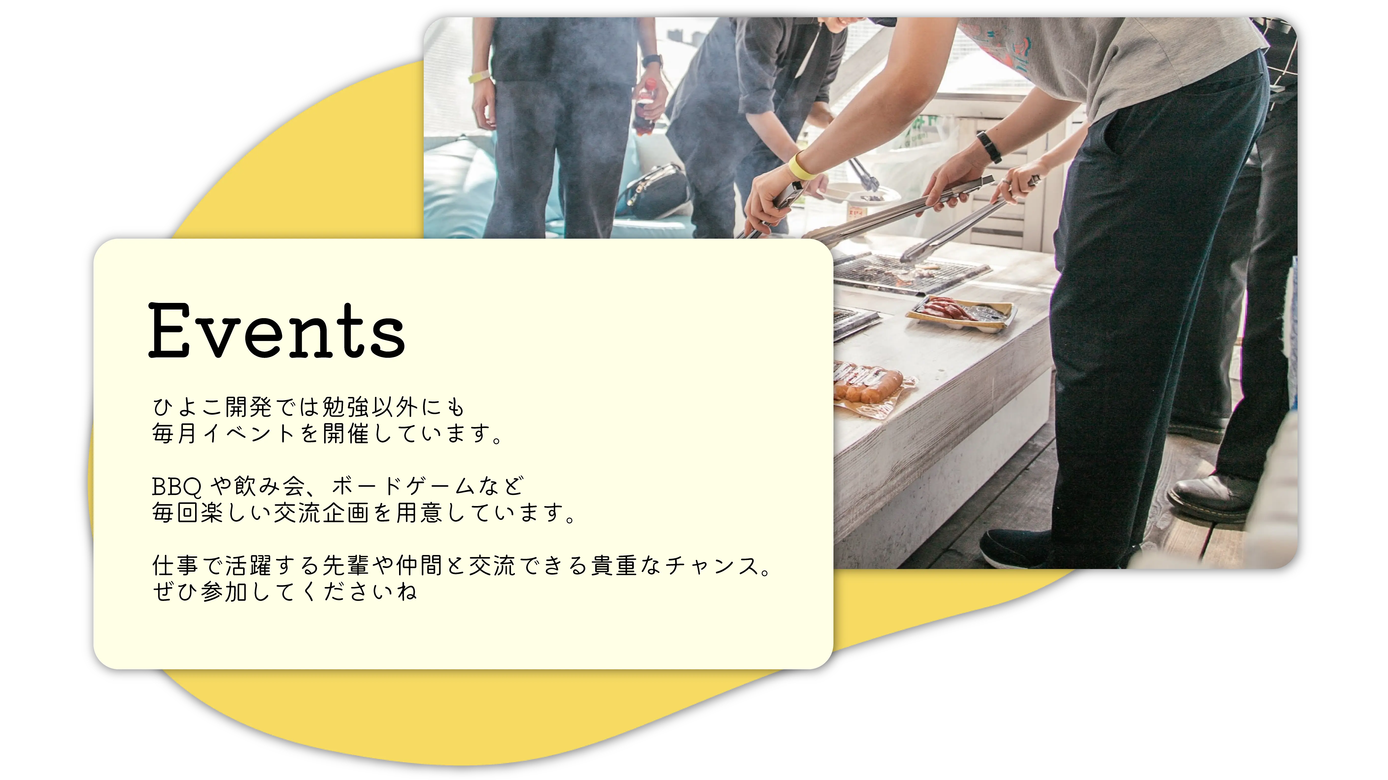 BBQや飲み会、ボードゲームなど、毎回楽しい交流企画を用意しています。